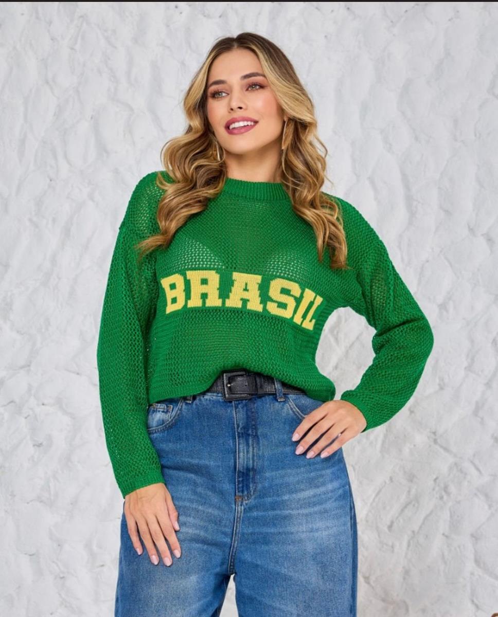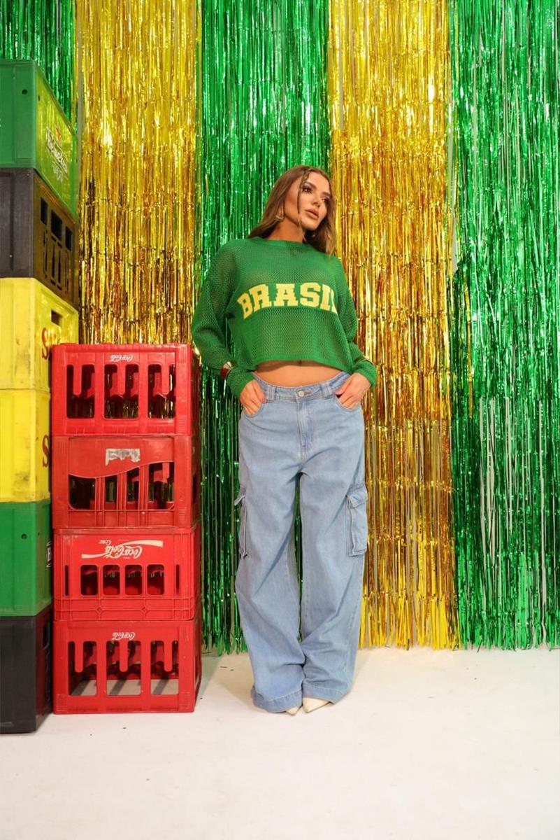 Tricô Brasil Verde em Linho Manga Longa Cropped