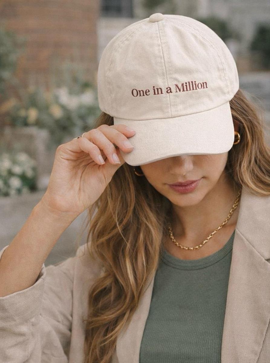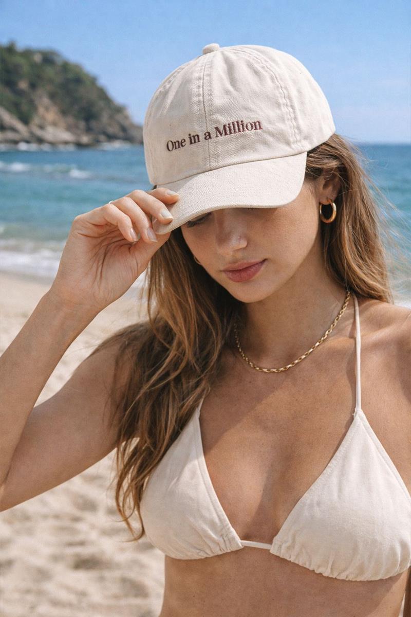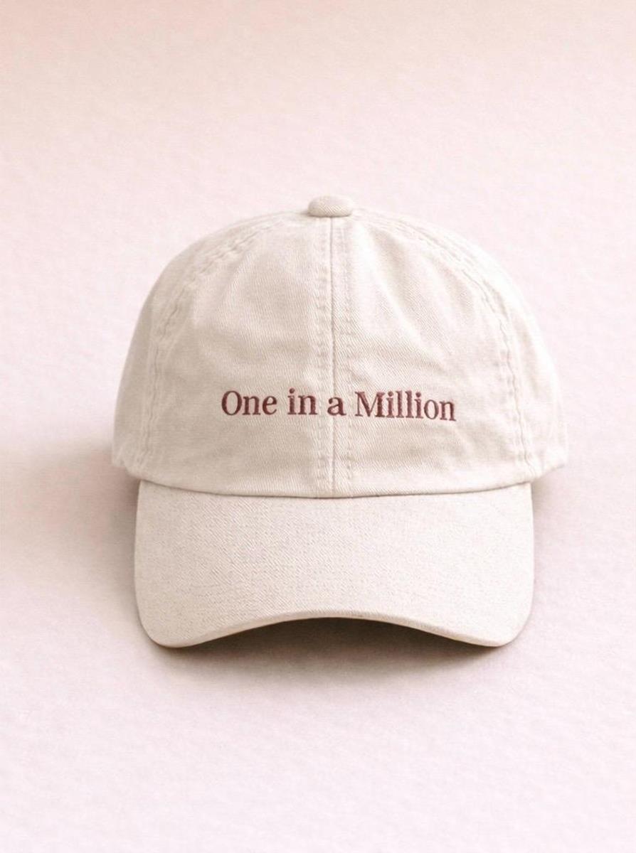 Em modelagem dad hat, com copa macia e caimento natural, a peça foi pensada para acompanhar o ritmo do dia a dia com conforto absoluto. O bordado frontal One in a Million em marrom cria um contraste sutil e refinado, reforçando a identidade da marca com delicadeza e intenção. O tom off white ilumina a composição e acrescenta leveza ao visual, mantendo uma estética elegante e contemporânea.